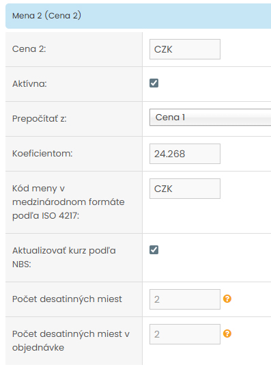 V sekcii Mena 2 (Cena 2) sa nachádza prepínač "Aktívna", ktorým sa zapína alebo vypína používanie tejto druhej meny. Po aktivácii systém začne pracovať s alternatívnou menou a zobrazovať ju tam, kde je to nastavené (napr. produkt, košík, detail produktu).